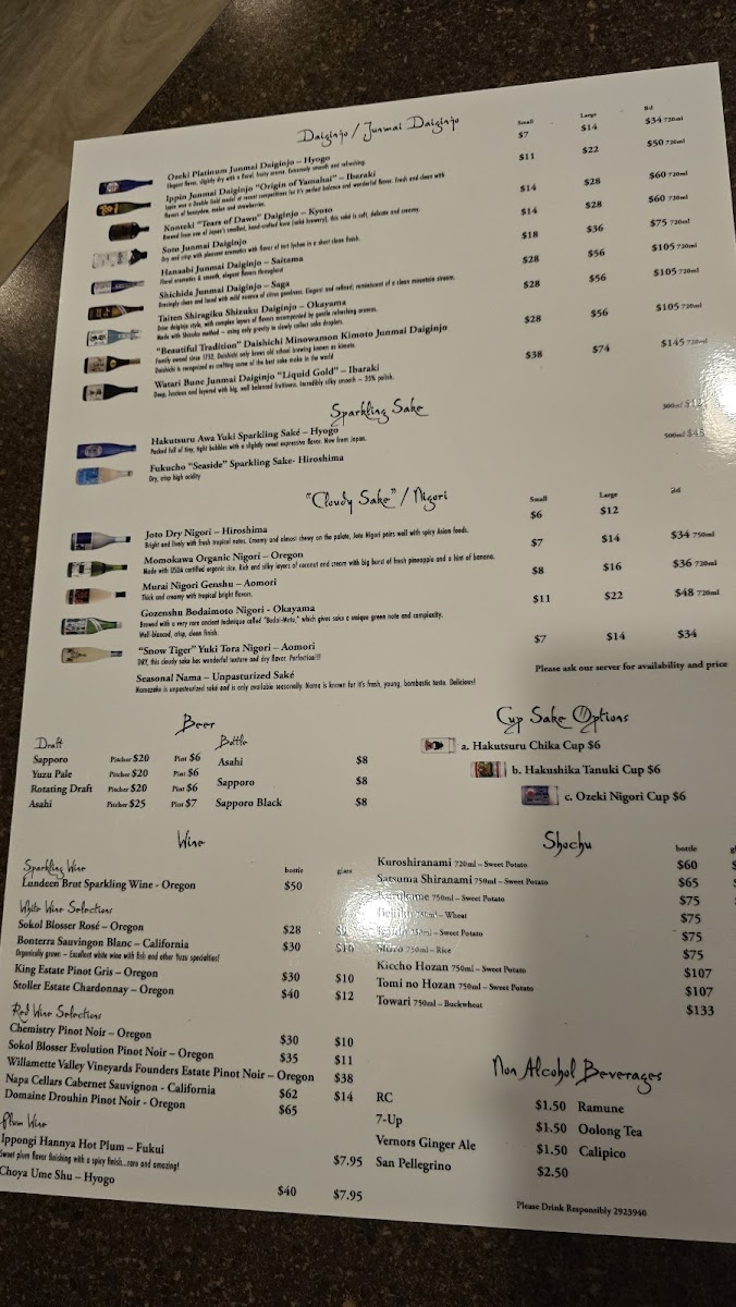 For beverages, the menu offers beer and a selection of sake to accompany the meal.